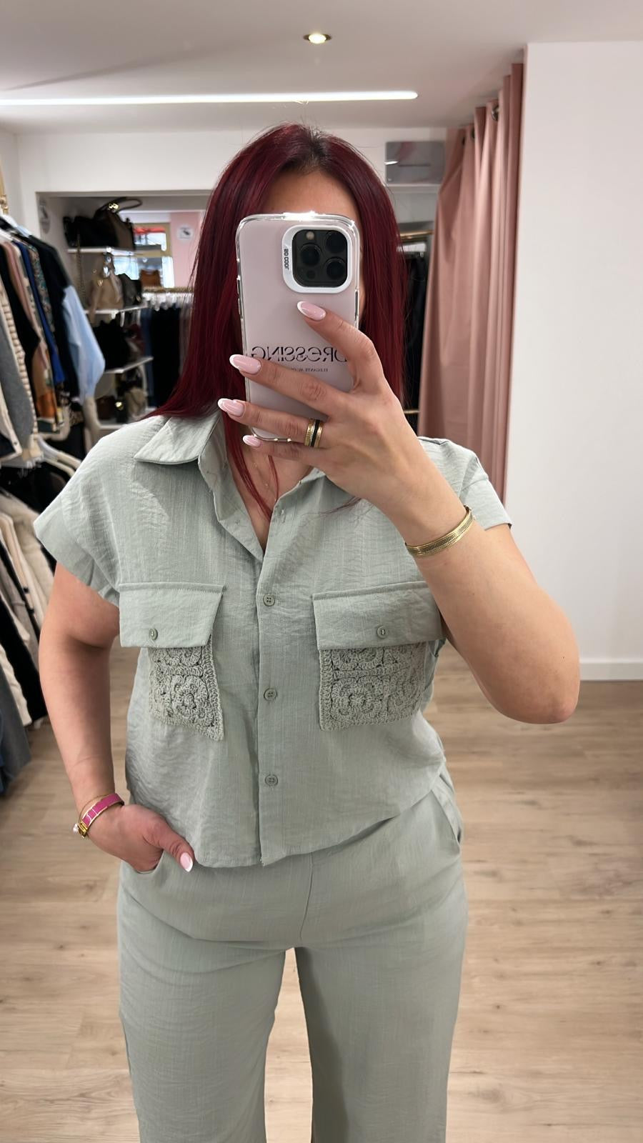 Ensemble kaki Cet ensemble kaki élégant est orné de broderies délicates au niveau des poches, ajoutant une touche de style et de sophistication à votre tenue. Confectionné avec soin et attention aux détails, cet ensemble est parfait pour toute occasion spéciale ou pour un look de tous les jours.